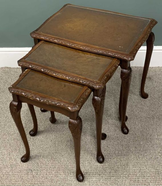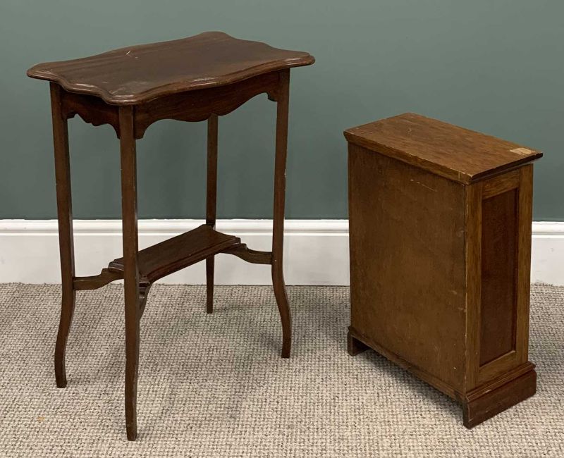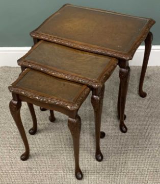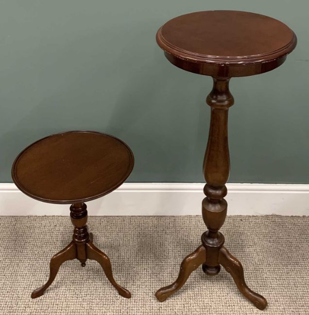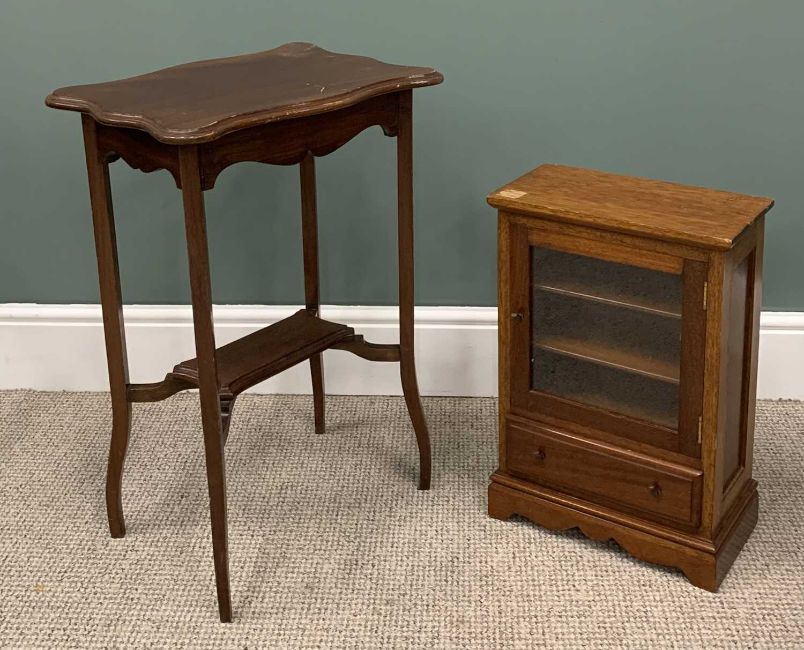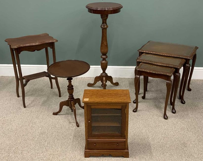 VARIOUS VINTAGE & REPRODUCTION OCCASIONAL FURNITURE comprising walnut nest of three glass top tables, 56 (h) x 59 (w) x 43cms (d) the largest, circular top tripod planter stand, 100 (h) x 40cms (top diam.), tray-top mahogany tripod wine table, 54 (h) x 40cms (diam. top), two-tier rectangular side table, 69 (h) x 48 (w) x 34cms (d) and a small single glazed door, single drawer table top mahogany cabinet, 51 (h) x 36 (w) x 19cms (d)