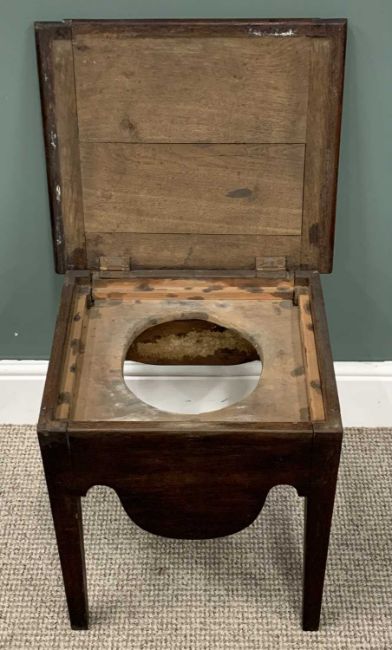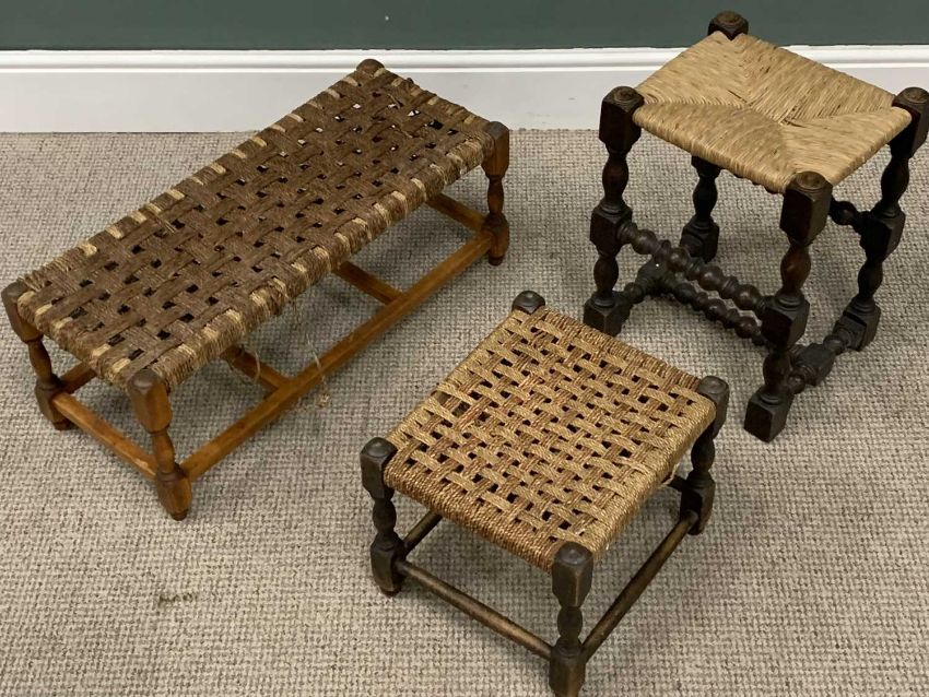FOUR VINTAGE STOOLS comprising antique oak commode stool, cleated end lift-lid, potty aperture, shaped aprons, square supports, 51cms (h), 47cms (w), 41cms (d), oak rush seated stool, turned and block supports and stretchers, 47cms (h), 34cms (w), 29.5cms (d), two string top stools, 29cms (h), 73cms (l), 30cms (d) the largest, 30cms (h), 36cms (w), 32cms (d) the smallerProvenance: private collection Conwy