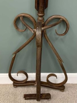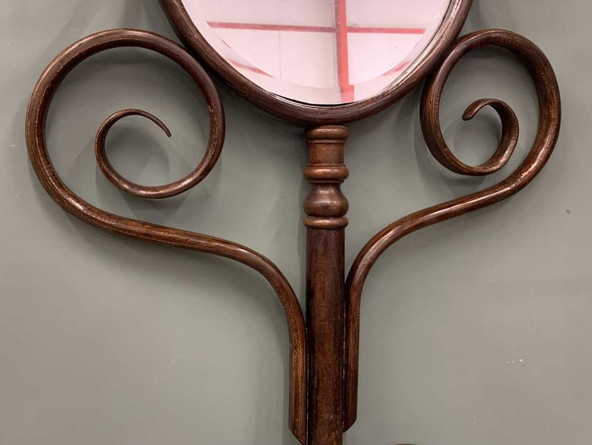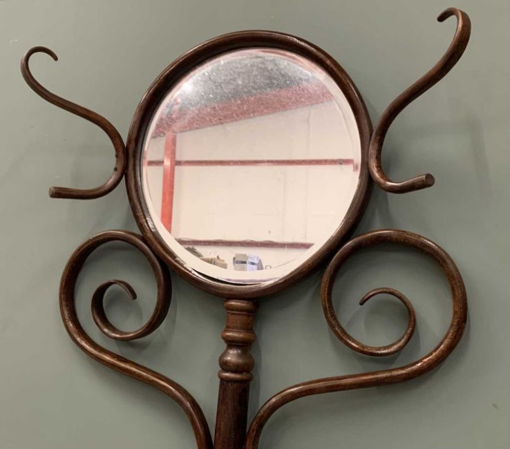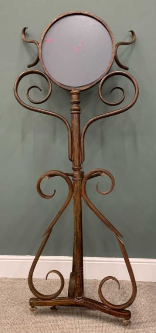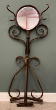 BENTWOOD MIRRORED HALL STAND THONET STYLE, (for restoration), bevel edged circular mirror, classic scrollwork design throughout, 182cms (h), 74cms (w), 30cms (d)Provenance: private collection Conwy