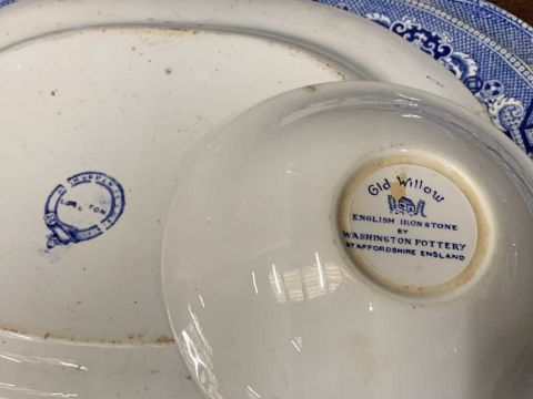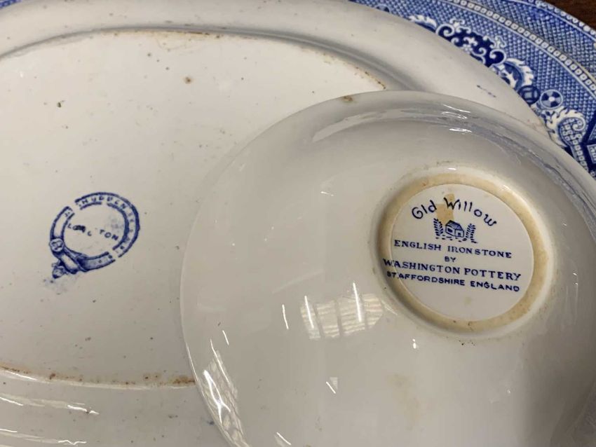 SIXTY PIECE WILLOW PATTERN POTTERY DRESSER SET, comprising eight various meat platters, 46 x 36cms the largest, various sized plates, bowls, side plates and two gravy boatsProvenance: private collection Denbighshire