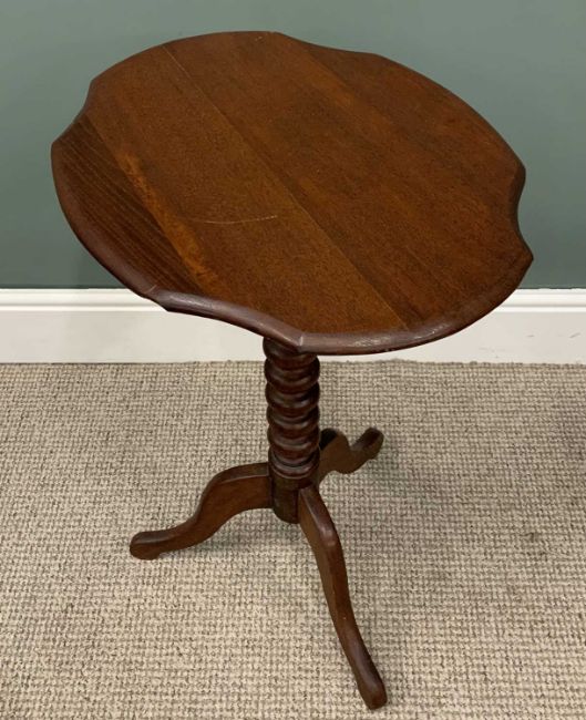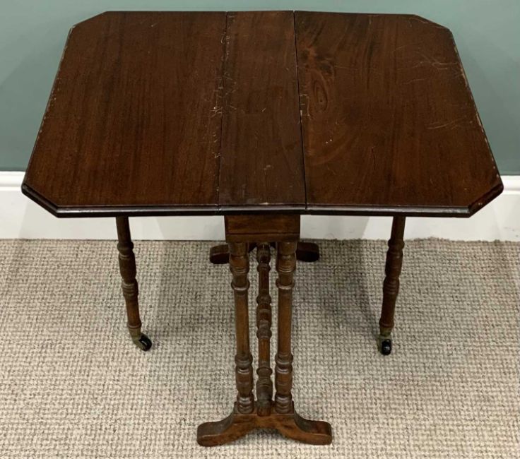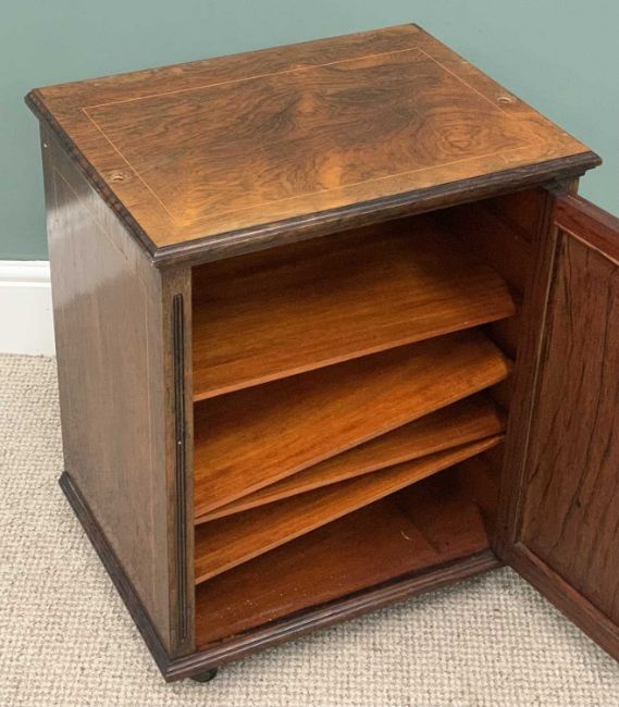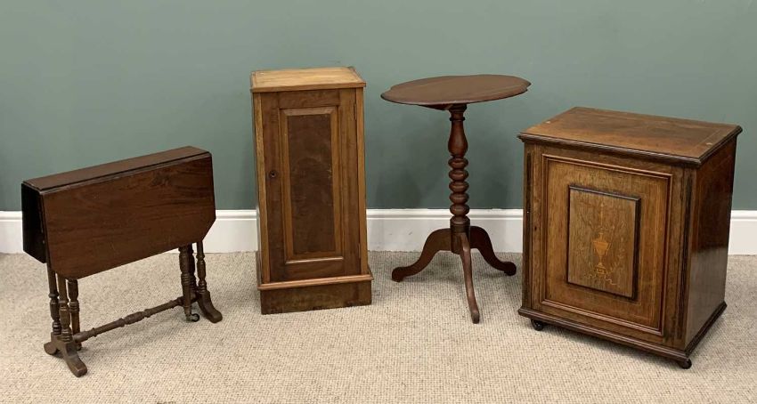 FOUR ITEMS OF ANTIQUE FURNITURE comprising Thomas Turner Manchester inlaid rosewood music cabinet base, stamped to the door top, numbered 4093, lacking upper section, raised panel front, urn and swag inlay detail, interior sheet music shelves, black pot castors, 64cms (h), 53cms (w), 39cms (d), mahogany Sutherland table, twin flap, turned supports and stretcher, brass cups, black pot castors, 56cms (h), 14.5cms (w) closed, 65cms (w) fully open, 55cms (l), walnut single door bedside cabinet, 76cms (h), 36cms (w), 33cms (d), mahogany tripod table, shaped top, bobbin turned column, splayed supports, 72cms (h), 54cms (w), 43cms (d)Provenance: private collection Conwy