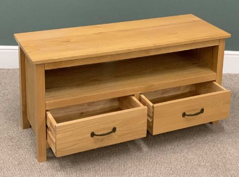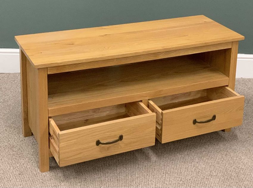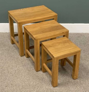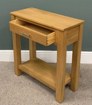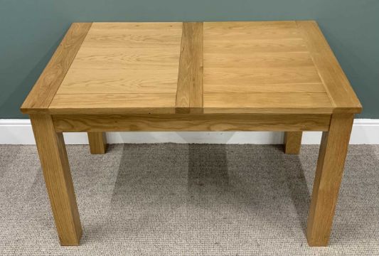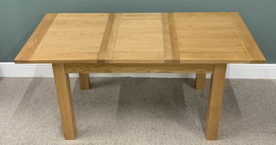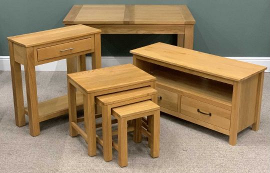 MODERN LIGHT OAK FURNITURE PARCEL, comprising extending dining table, 75 (h) x 120.5 (l) closed, 166 (l) with additional leaf x 80cms (w), single drawer console table, conjoining under-tier shelf, 76 (h) x 70 (w) x 30cms (d), two drawer entertainment stand, 54.5 (h) x 108 (w) x 40.5cms (d), nest of three occasional tables, 51.5 (h) x 55 (w) x 40cms (d) the largestProvenance: deceased estate Conwy