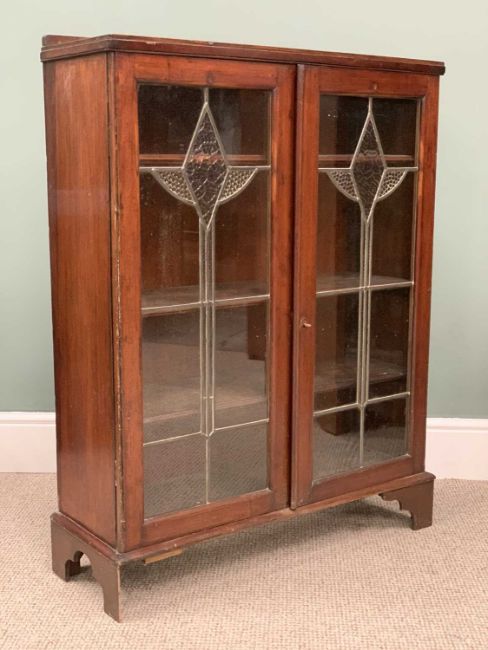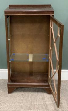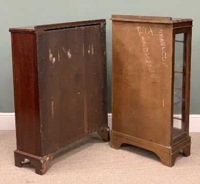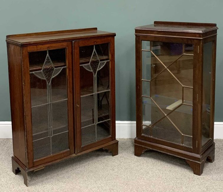 TWO VINTAGE CHINA DISPLAY CABINETS, mahogany single door, glass interior shelves, 115 (h) x 60.5 (w) x 33cms (d), Art Deco style two door, leaded glass, interior wooden shelves, 110 (h) x 85 (w) x 29cms (d)Provenance: private collection Conwy