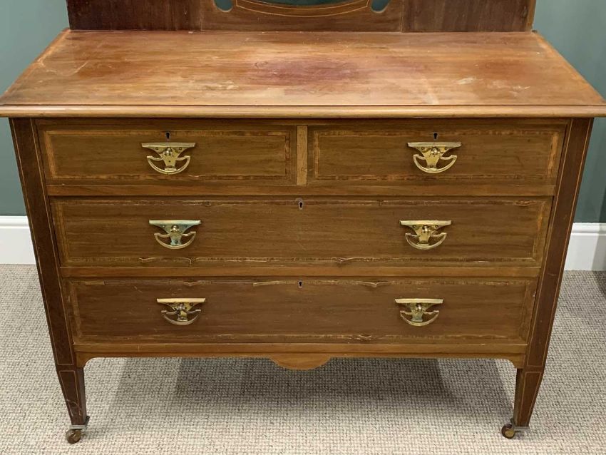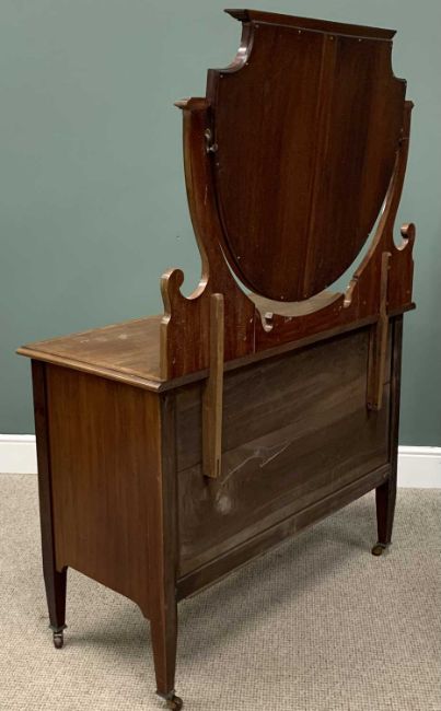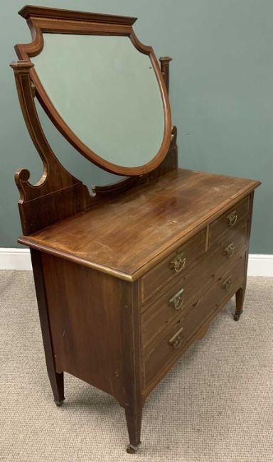 TWO ITEMS OF BEDROOM FURNITURE circa 1900, comprising four-fold oak dressing screen, pollard oak veneers to the inset panels, brass hinges, 146 (h) x 185cms (w), mahogany mirrored dressing chest, boxwood stringing and cross banding, shield shaped mirror, bevel edged glass, two short, two long drawers, stylised brass pull handles, tapering supports, brown pot castors, 163 (overall h) x 115 (w) x 52cms (d)Provenance: private collection Conwy