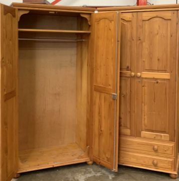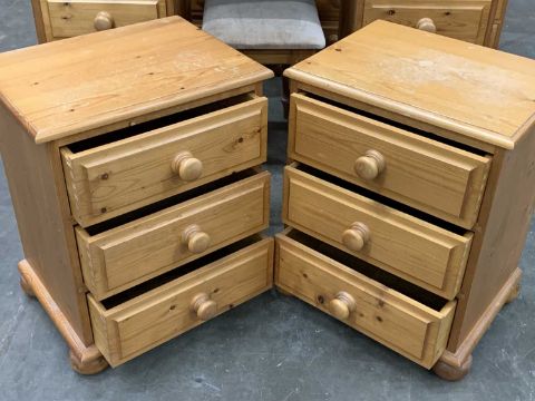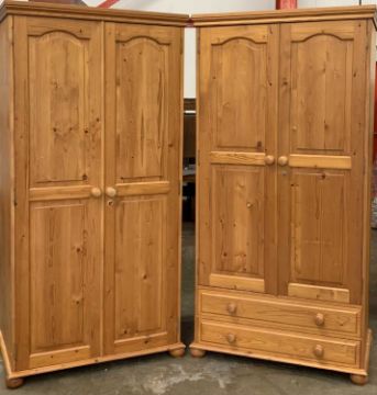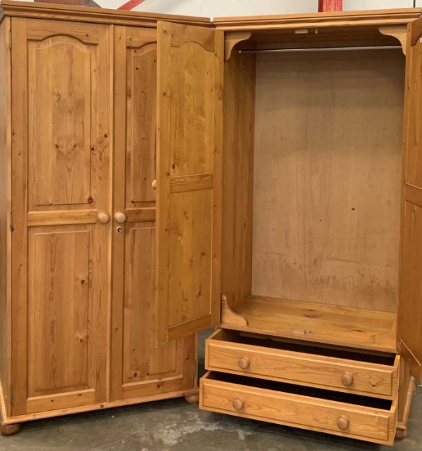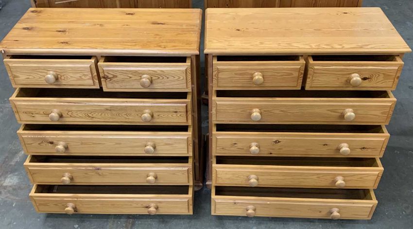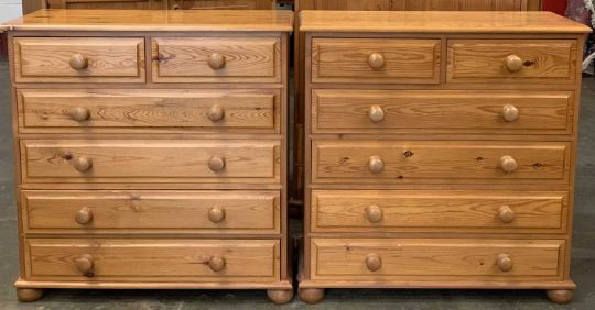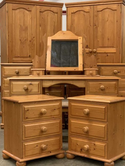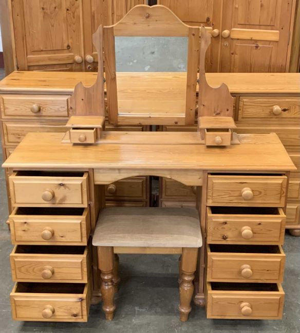 EIGHT PIECE MODERN PINE BEDROOM SUITE, comprising double wardrobe with twin base drawers, 192 (h) x 96 (w) x 60cms (d), double door wardrobe, 192 (h) x 96 (w) x 60cms (d), two chests of drawers, two short, four long drawers, 93 (h) x 91 (w) x 44cms (d), mirrored dressing table, upper drawer pods, knee hole centre, twin sets of four drawers flanking, 141 (overall h) x 130 (w) x 44cms (d), upholstered dressing stool, 46 (h) x 50 (w) x 35cms (d), two three drawer bedside chests, 60 (h) x 48 (w) x 36cms (d), all the main items have turned wooden knobs and turned bun feetProvenance: private collection Conwy