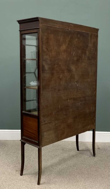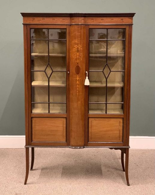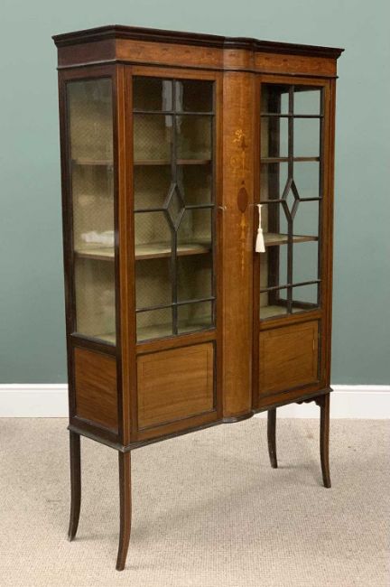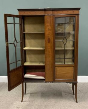 EDWARDIAN INLAID MAHOGAY CHINA CABINET, ribbon swag and scroll inlay, boxwood stringing, bow front central panel, twin nine pane astragal glazed doors, fabric covered back and interior shelves, lower panels to the doors, splayed supports, 169 (h) x 105 (w) x 34cms (d)Provenance: private collection Powys
