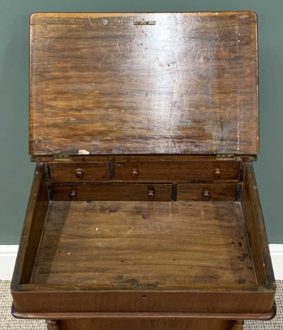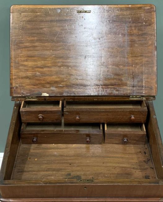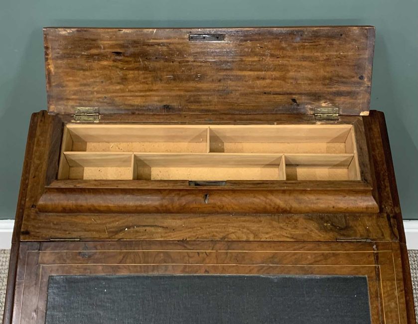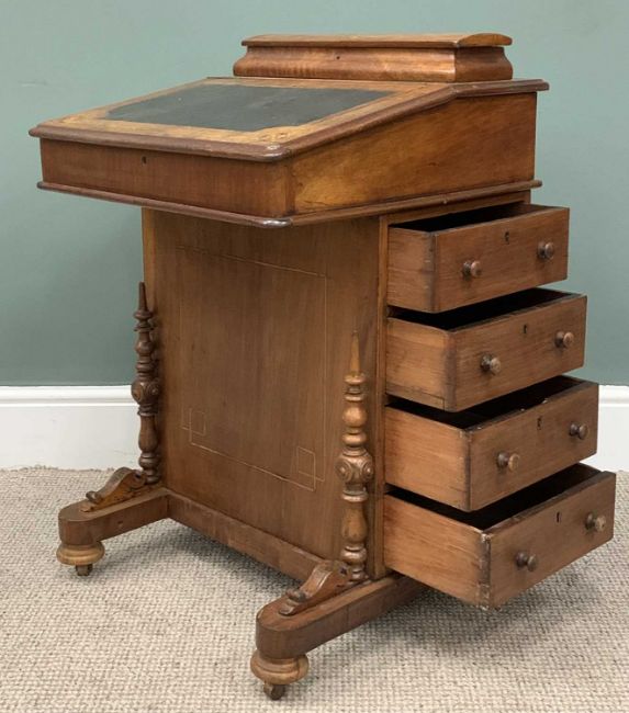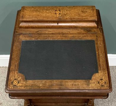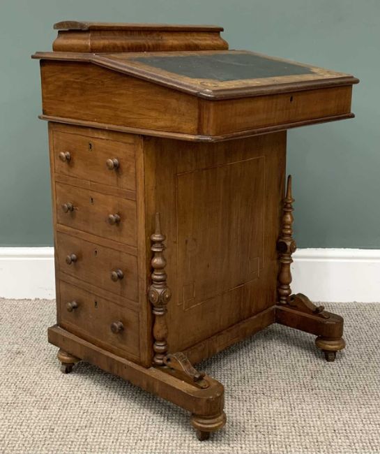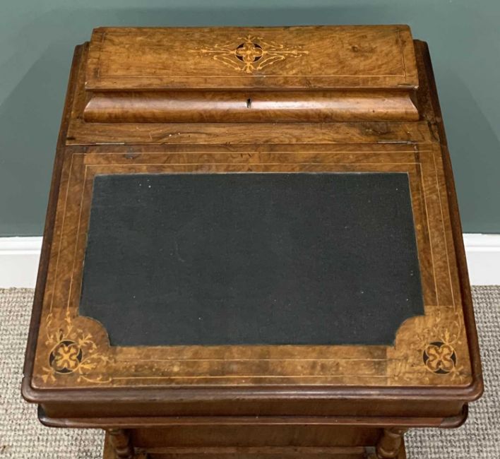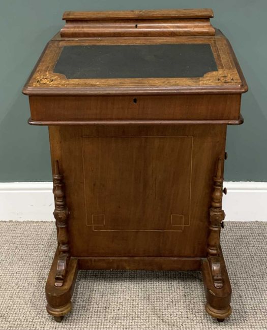 VICTORIAN WALNUT DAVENPORT, lidded top box with inner compartments, inlaid detail repeated to the slope, inset skiver writing surface, interior drawers, four opening side drawers, four blind side drawers, all with turned wooden knobs, carved and corbel front pillars, platform feet, hardwood castors, 83cms (h), 54cms (w), 53cms (d)Provenance: private collection Conwy