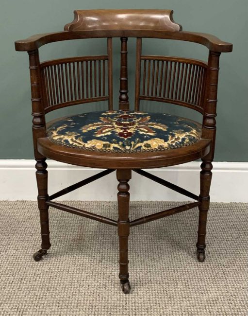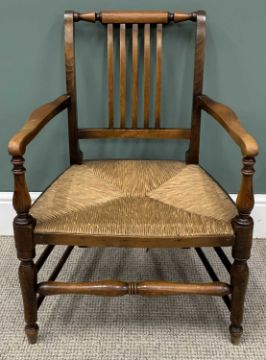 TWO SMALL ARMCHAIRS Edwardian and later, comprising line-inlaid mahogany tub type example, curved spindle gallery back, fabric covered oval seat, brass button detail, turned uprights, supports and stretchers, brown pot castors, 73 (h) x 58 (w) x 42cms (seat d), reproduction ash example, rush seat, turned crest rail, slatted back, swept arms, turned and block supports, 76 (h) x 53 (w) x 40cms (seat d)Provenance: private collection Denbighshire