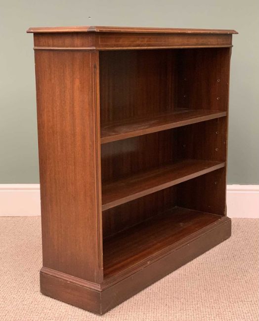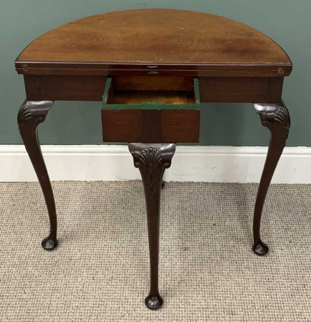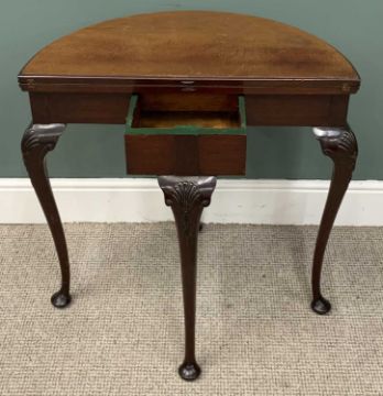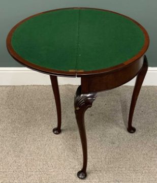 TWO ITEMS OF VINTAGE & LATER OCCASIONAL FURNITURE, comprising circa 1920, mahogany fold over half-moon card table, interior green baize, carved knee detail, four turned supports, pad feet, 74 (h) x 75.5 (diam. open) x 76 (w) x 38cms (d closed), reproduction mahogany open bookcase, interior adjustable shelves, plinth base, 93 (h) x 92 (w) x 28cms (d)Provenance: private collection Conwy