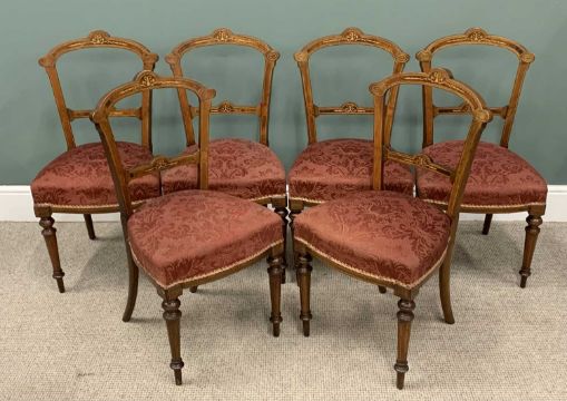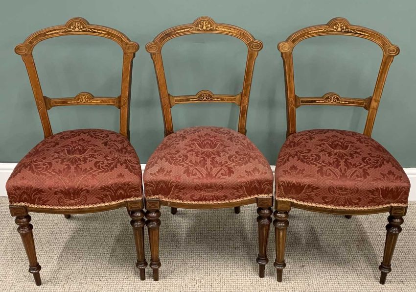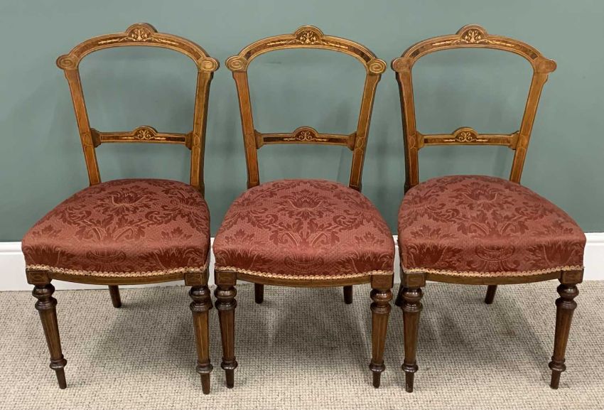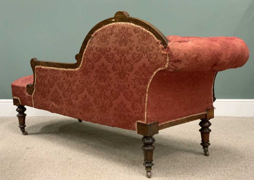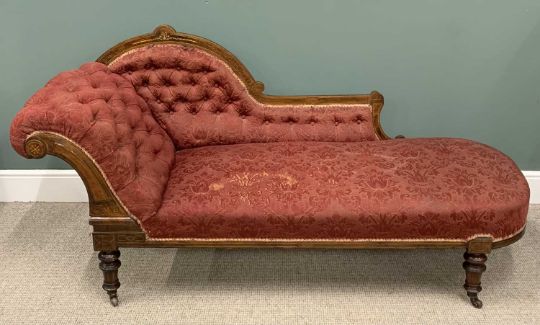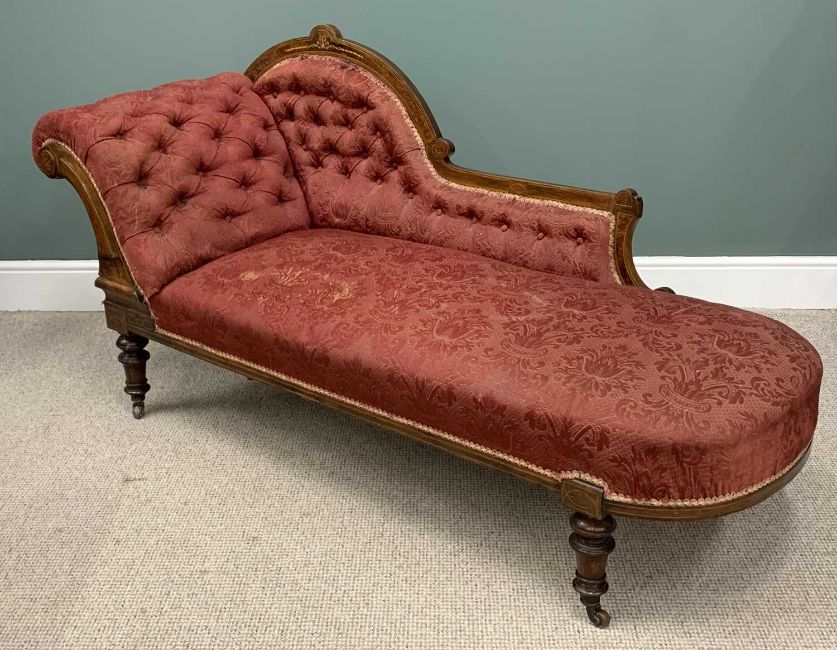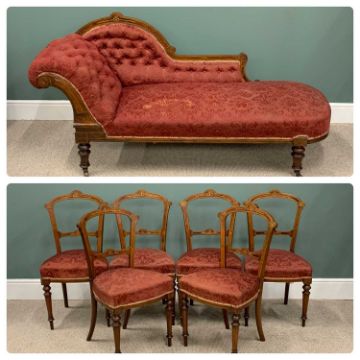 SEVEN PIECE INLAID WALNUT PARLOUR SUITE, late Victorian, comprising button back upholstered chaise lounge, shaped back, curled over end, turned supports, brown pot castors, 95 (h) x 200 (l) x 69cms (d), six matching side chairs, slightly curved backs, stuff over seats, turned tapering front supports, 89 (h) x 46 (w) x 38cms (seat d)Provenance: private collection Denbighshire