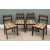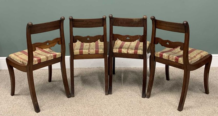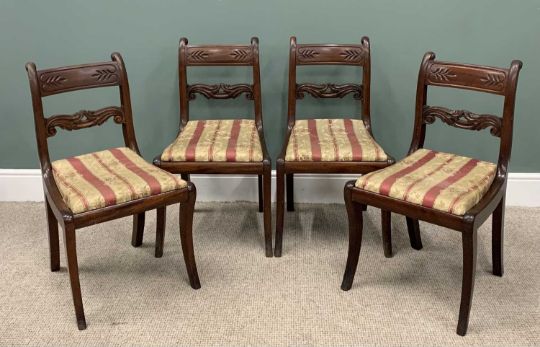 SET OF FOUR REGENCY MAHOGANY SABRE LEG CHAIRS, slightly curved backs, scroll and leaf carved centre rail, striped satin upholstered drop-on seat pads, sabre supports, 84cms (h), 47cms (w), 38cms seat depthProvenance: private collection Conwy