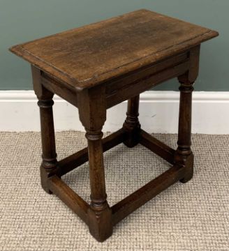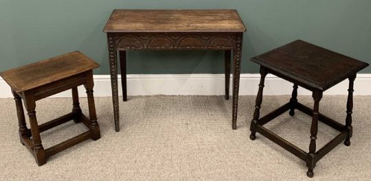 THREE PIECES VINTAGE OAK OCCASIONAL FURNITURE, comprising rectangular top side table, carved frieze, tapering square supports, 68 (h) x 80.5 (w) x 40.5cms (d), square top side table, turned and block supports, cross stretchers, 54 (h) x 45 (w) x 45cms (d), reproduction oak joint stool, rectangular top, turned and block supports, cross stretchers, 48 (h) x 46 (w) x 28.5cms (d)Provenance: private collection Conwy