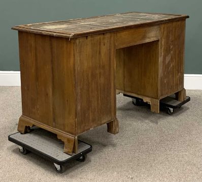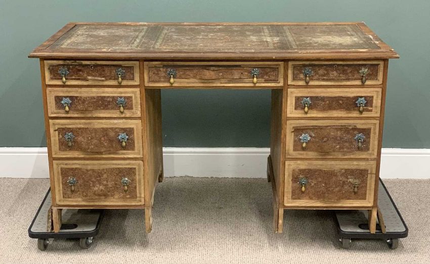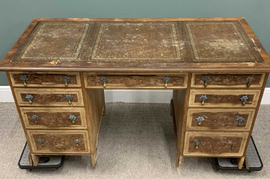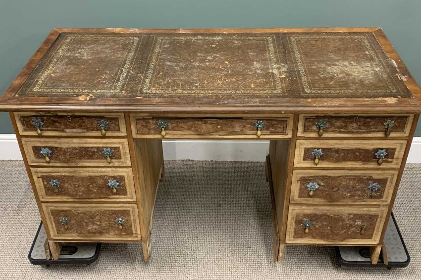 WALNUT TWIN PEDESTAL DESK 20th Century (for restoration), gilt tooled brown leather insert, central single frieze drawer, twin banks of four drawers, petal form backplates, drop handles, corner bracket base, 77 (h) x 138 (w) x 62cms (d)Provenance: private collection Conwy