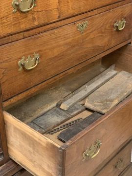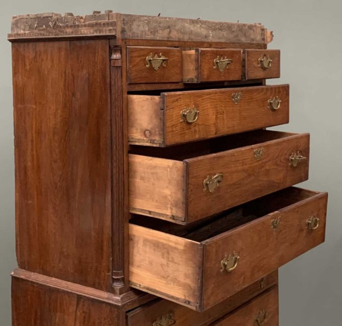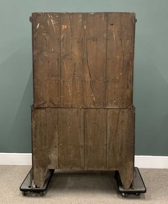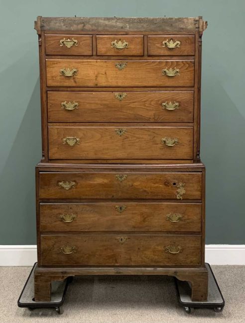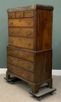 ANTIQUE OAK CHEST ON CHEST (for restoration), three short, three long upper drawers, three long lower drawers, replacement brassware, quarter cut reeded detail, corner bracket feet, 180 (h) x 110 (w) x 55cms (d)Provenance: private collection Conwy