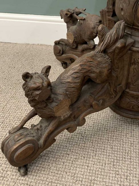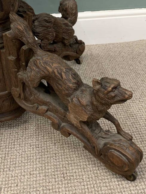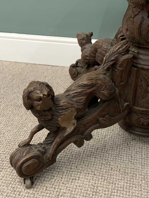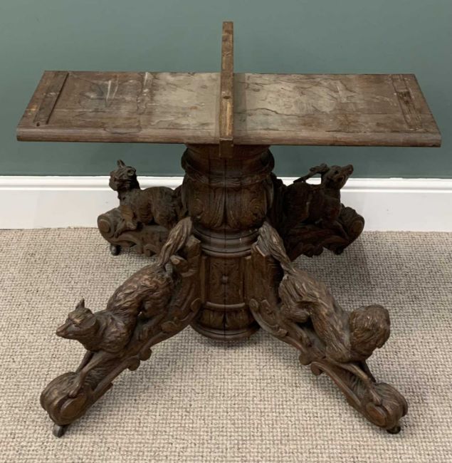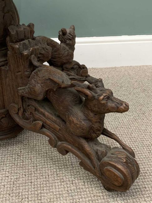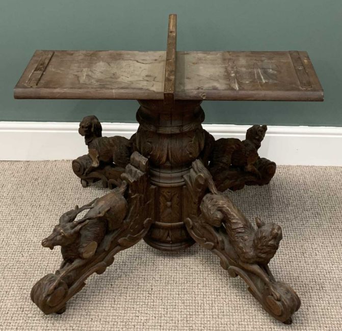 BLACK FOREST TYPE OAK TABLE BASE, substantial four footed carved column, three dogs and a stag detail, horn castors, 69 (h) x 82 (w) x 32cms (d)Provenance: private collection Conwy