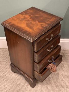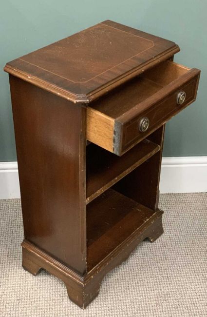REPRODUCTION FURNITURE PARCEL (4), comprising mahogany effect bookcase, adjustable shelving, 92 (h) x 92 (w) x 31cms (d), walnut effect four drawer chest, corner bracket feet, 61 (h) x 39 (w) x 32cms (d), similar single drawer open shelf side cabinet, 76 (h) x 45 (w) x 28cm (d), drum top table (lacking base), circular red gilt tooled leather insert, side opening drawers, 11 (h) x 49.5cms (diam.)Provenance: private collection Conwy
