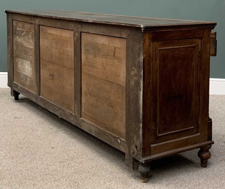 GEORGE III OAK & CROSS BANDED MAHOGANY LANCASHIRE DRESSER, circa 1800, shaped frieze, three shelf open back delft rack, three plank cross banded edge top, quarter cut reeded side pillars, seven opening oak lined drawers, cockbeaded edging, cross banded fronts, replacement turned wooden knobs, twin central cupboard doors, turned bun feet, 195 (h) x 217.5 (w) x 56cms (d), together with Harlequin 39 piece blue and white willow pattern dresser set which includes11 various sized platters, 46 x 36cms the largest, covered soup tureen, 23 (h) x 37cms (across), vegetable dishes and covers, open dishes etc.Provenance: private collection Powys