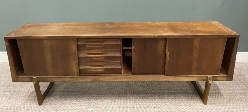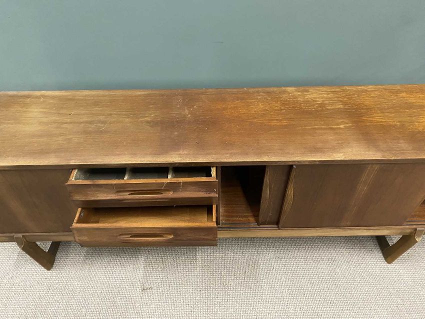 EON MID CENTURY TEAK LONG SIDEBOARD, three sliding cupboard doors, interior shelves, three opening drawers, shaped twin supports, EON = Elliot's of Newbury, 79 (h) x 221 (w) x 45cms (d)Private collection Conwy