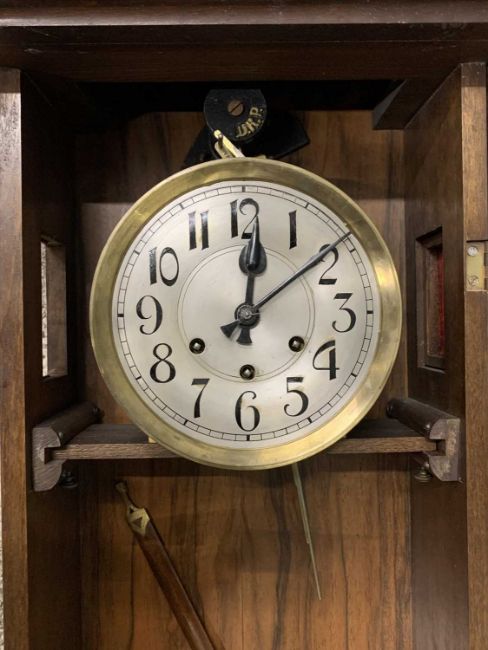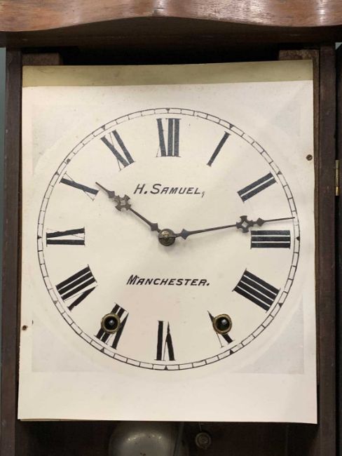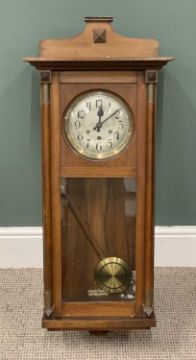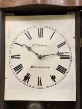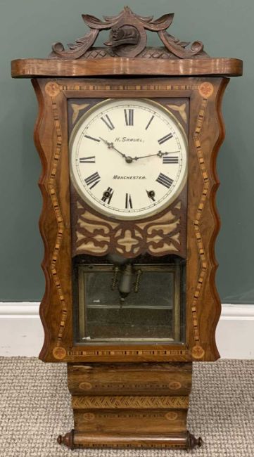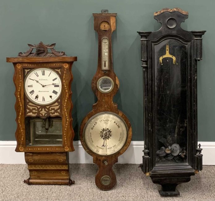 GUSTAV BECKER MAHOGANY & A WALNUT CASED VIENNA TYPE WALL CLOCKS, ebonised clock case and a mahogany banjo barometer, walnut clock marked H Samuel, Manchester, white dial, Roman numerals, chime strike movement, exposed pendulum, mirror back, inlay, fretwork and carved detail to the case, 91 (h) x 40 (w) x 16cms (d), other clock case and barometer for restoration, 111 x 38cms and 135 x 31cms. measurements respectively, Becker mahogany cased wall clock, silvered dial, Arabic numerals, pendulum driven chime strike movement, 97 (h) x 38cms (w)Provenance: private collection Conwy