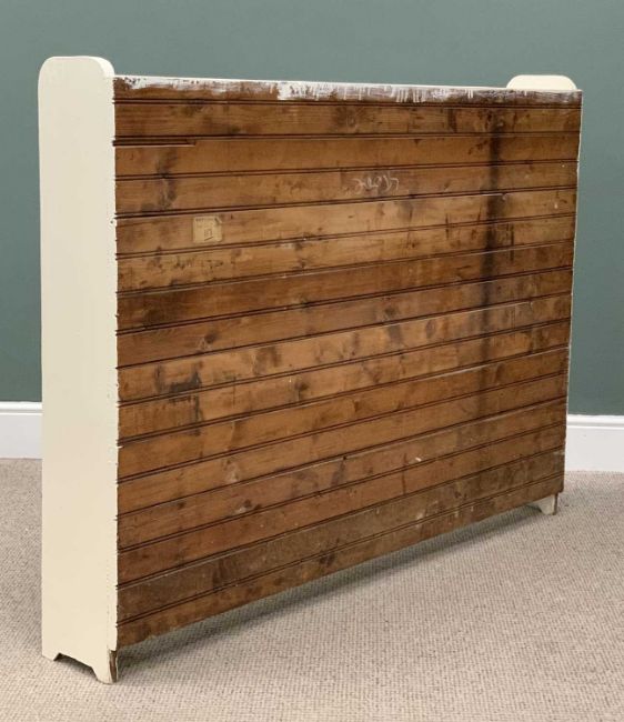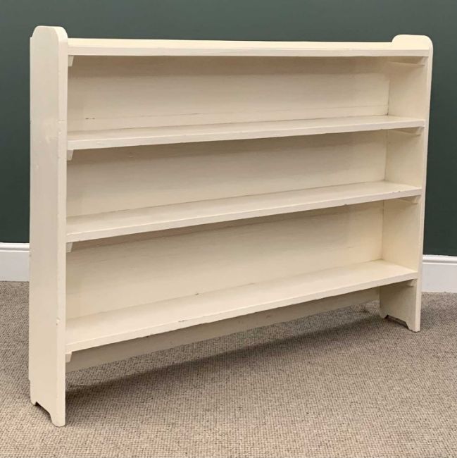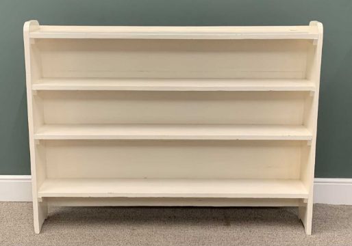 WHITE PAINTED VINTAGE BOOK/DISPLAY SHELVES, shaped ends, four open shelves, closed back, 116 (h) x 151 (w) x 23cms (d)Provenance: private collection Conwy