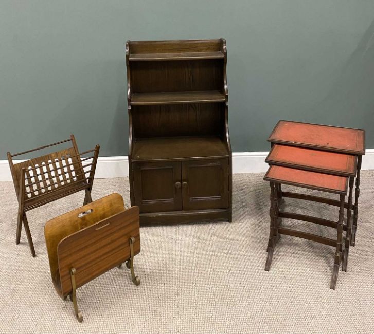 FOUR ITEMS VINTAGE & REPRODUCTION OCCASIONAL FURNITURE, comprising Ercol waterfall bookcase cupboard, twin lower cupboard doors, 111 (h) x 61 (w) x 34cms (d), reproduction nest of three tables, gilt tooled red leather tops, 57 (h) x 51 (w) x 36cms (d) the largest, two magazine racks, one bentwood form, the other folding, various measurementsProvenance: private collection Conwy