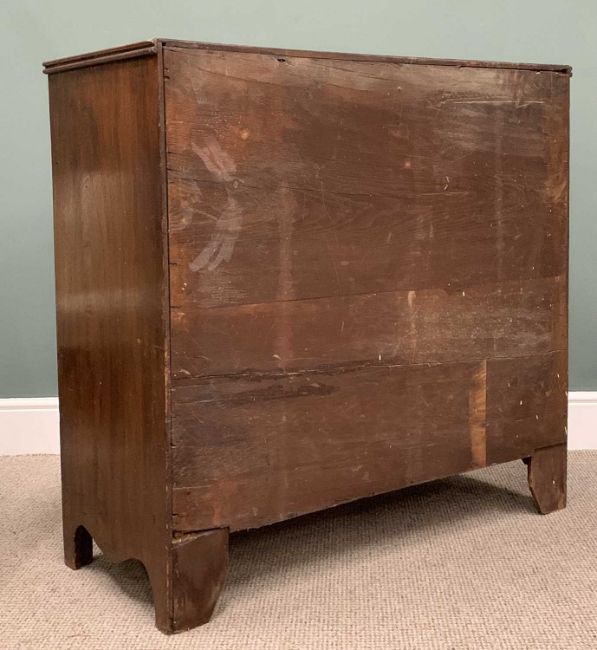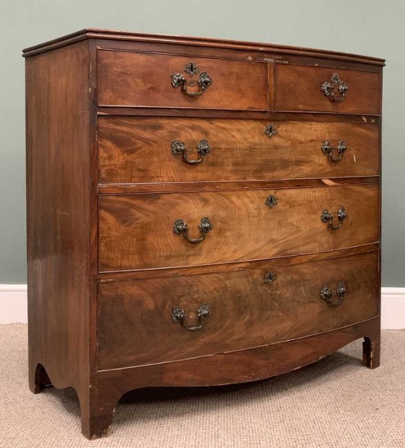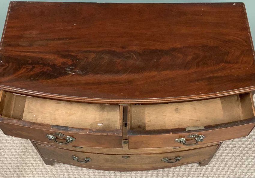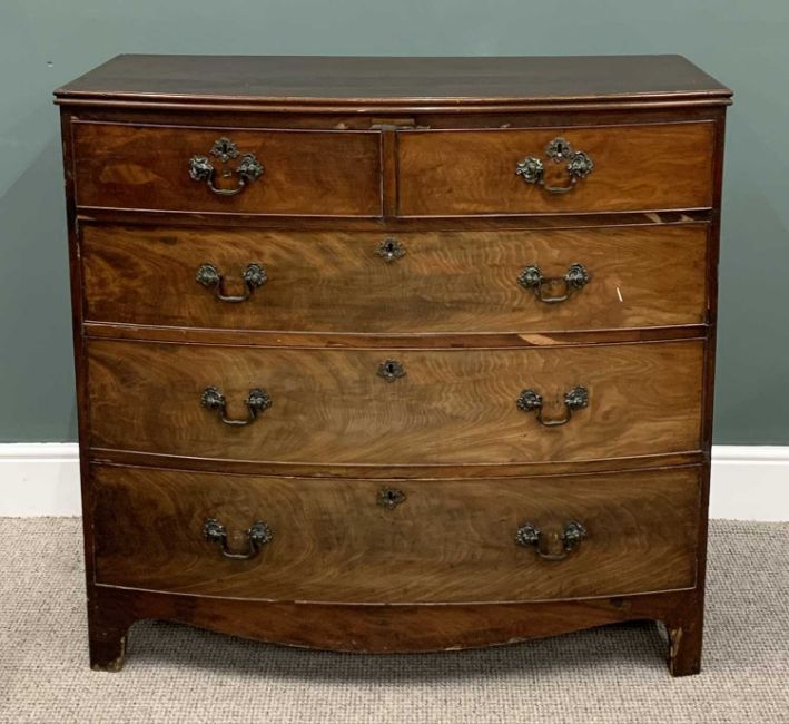 19TH CENTURY BOW FRONT MAHOGANY CHEST, two short, three long pine lined drawers, cockbeaded edging, replacement fancy brass pommels, swan neck handles, corner bracket feet, 103.5 (h) x 109 (w) x 52cms (d)Provenance: deceased estate Gwynedd