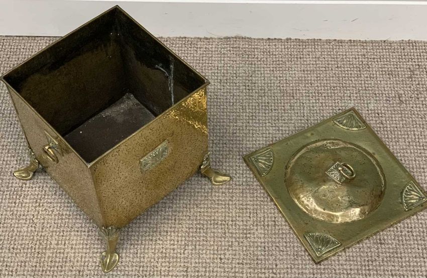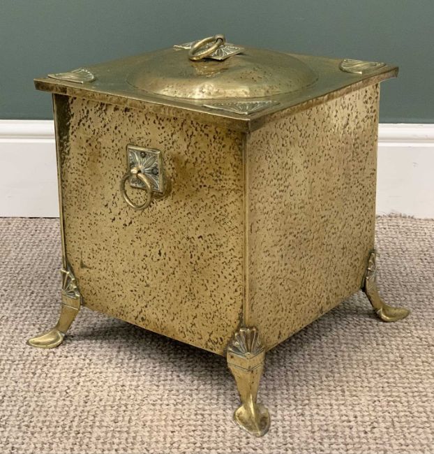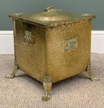 ARTS & CRAFTS STYLE LIDDED BRASS COAL BOX, ring lid lift and carry handles, Egyptian fan type detail, stylised corner feet, 36 (h) x 37 (w) x 37cms (d)Provenance: private collection Powys
