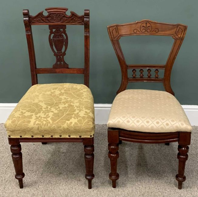 FOUR VICTORIAN/EDWARDIAN SIDE CHAIRS, comprising Chippendale style carved mahogany nursing chair, Classical stripe upholstered seat, shaped front supports, brown pot castors, 77cms (h), 45cms (w), 42cms (d), mahogany spoonback example, upholstered back and seat, shaped front supports, 90cms (h), 48cms (w), 38cms seat depth, satin walnut side chair, shaped slightly curved back, spindle balustrade central rail, upholstered drop-on seat pad, turned tapering front supports, 87cms (h), 44cms (w), 34cms seat depth, Edwardian mahogany side chair, shaped crest rail, carved detail and urn central splat, stuff over upholstered seat, turned front supports, 96cms (h), 47cms (w), 42cms seat depthProvenance: private collection Conwy