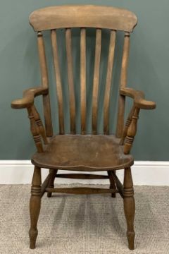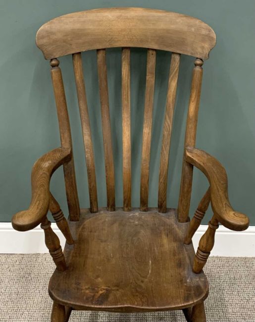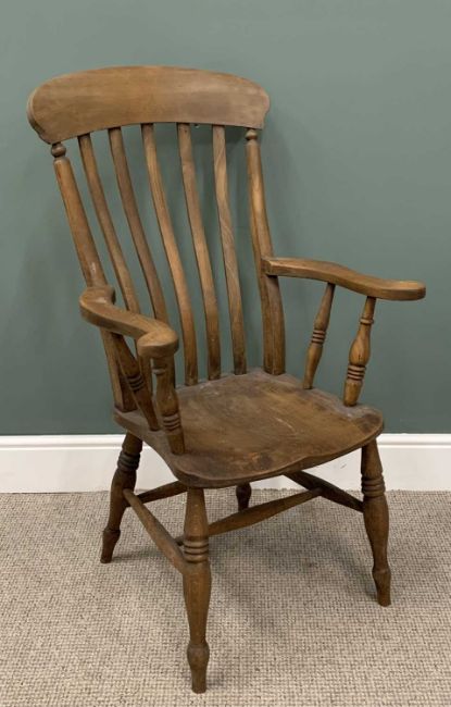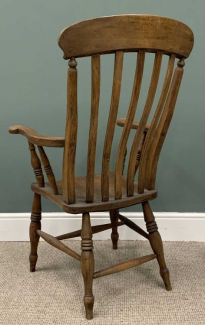 ASH & ELM FARMHOUSE WINDSOR CHAIR, slightly curved back, swept curled end arms, turned spindles, shaped solid seat, turned supports, H stretcher, 114 (h) x 64 (w) x 42cms (seat d)Provenance: private collection Conwy