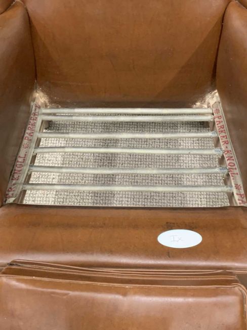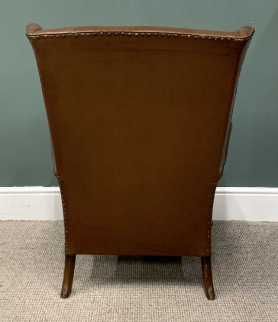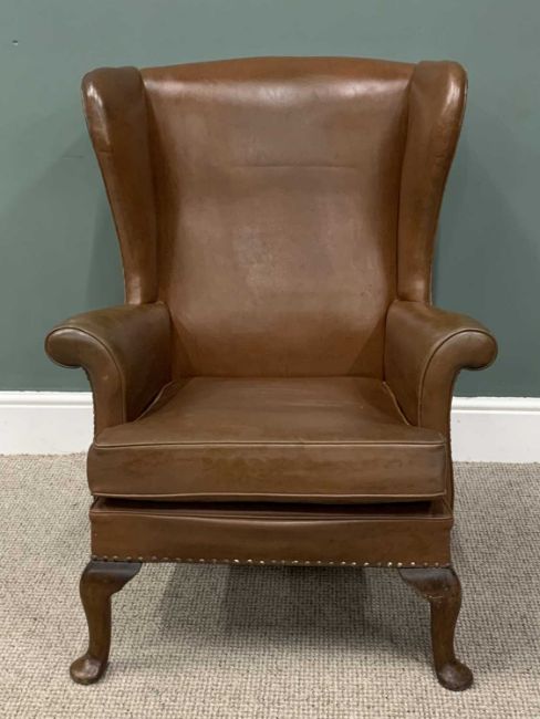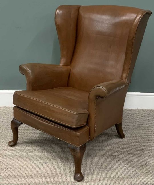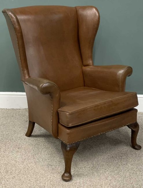 PARKER KNOLL WINGBACK ARMCHAIR in brown leather-effect, curled arm ends, metal button detail, Queen Anne front supports, 96 (h) x 76 (w) x 50cms (seat d)Provenance: private collection Conwy