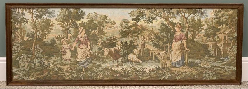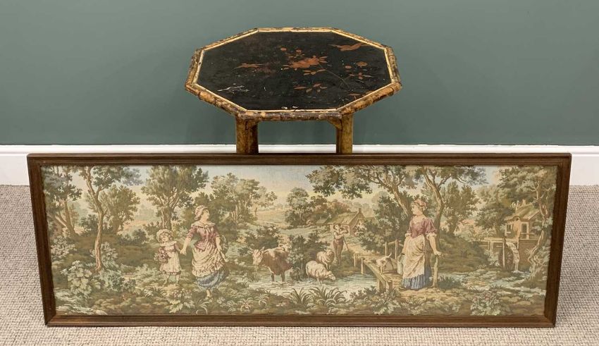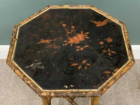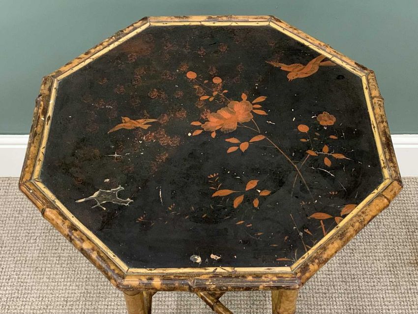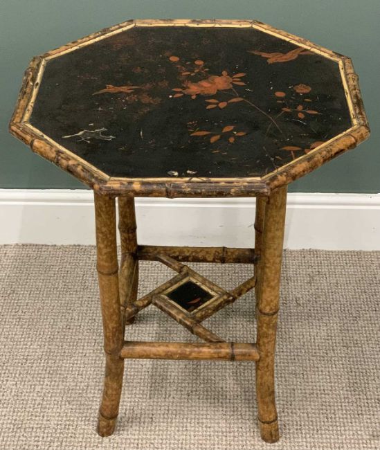 VICTORIAN BAMBOO SIDE TABLE & A FRAMED MODERN TAPESTRY, octagonal top, lacquered bird and floral detail, conjoining under tier shelf, 71 (h) x 60 (w) x 60cms (d), traditional countryside scene with cattle and figures, tapestry 53 x 149cmsProvenance: private collection PowysComments: tapestry framed and glazed