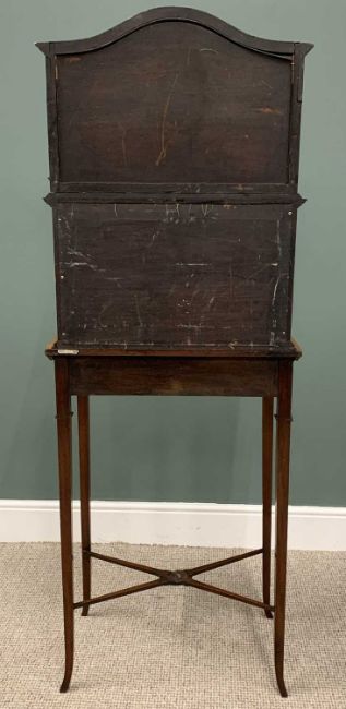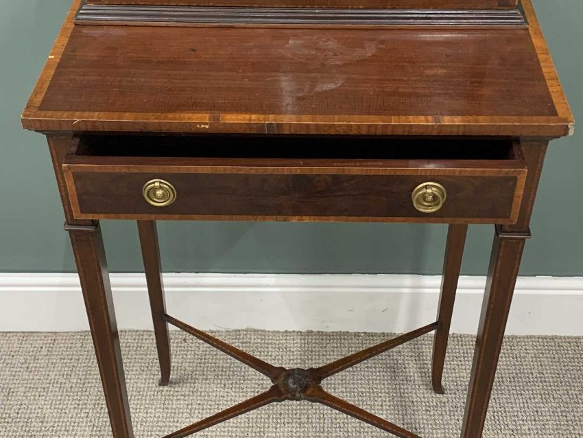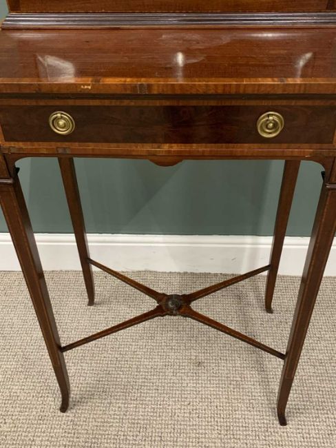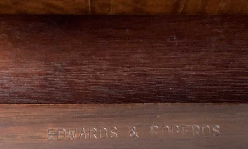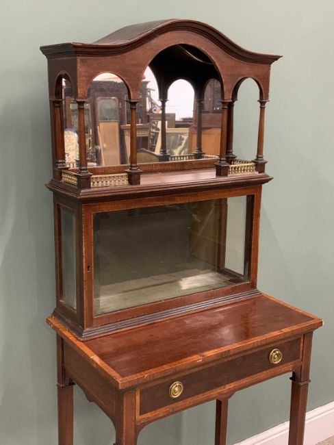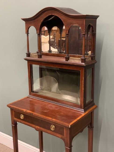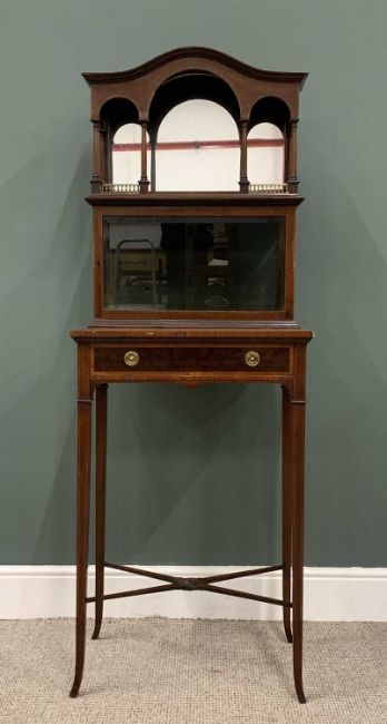 EDWARDIAN CROSSBANDED MAHOGANY DISPLAY TOP SIDE TABLE, (marriage), shaped top canopy mirror, turned pillar and brass balustrade detail, single door lower display cabinet, bevelled edge glass, cross banded table top, single drawer stamped Edwards & Roberts, ring-pull handles, swept tapering supports, conjoining X stretcher, 169 (h) x 61.5 (w) x 40cms (d)Provenance: private collection Conwy