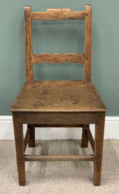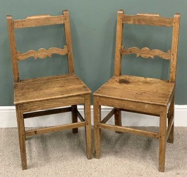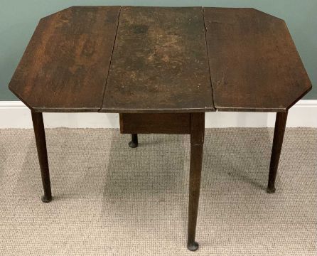 GEORGE III OAK GATELEG TABLE & THREE ELM NEAR-MATCHING FARMHOUSE CHAIRS (2+1), twin flap table, cut off corners, turned tapering supports, pad feet, 73 (h) x 92 (l) x 40 (w) closed, 107cms (w) fully open, 90 (h) x 46 (w) x 33cms (d) the pair, 86 (h) x 46 (w) x 35cms (seat d) the otherProvenance: private collection Powys