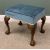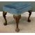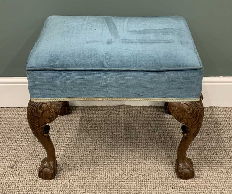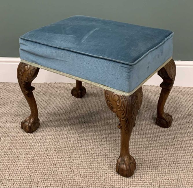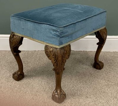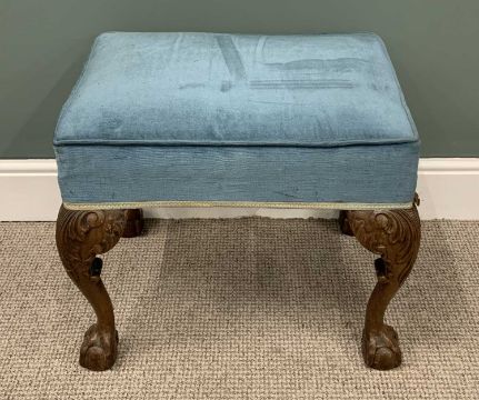 CARVED WALNUT LARGE FOOTSTOOL, blue upholstery, leaf knee detail, ball and claw feet, 50cms (h), 57cms (w), 43cms (d)Provenance: private collection Conwy