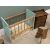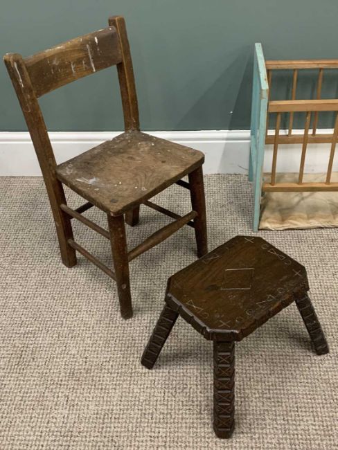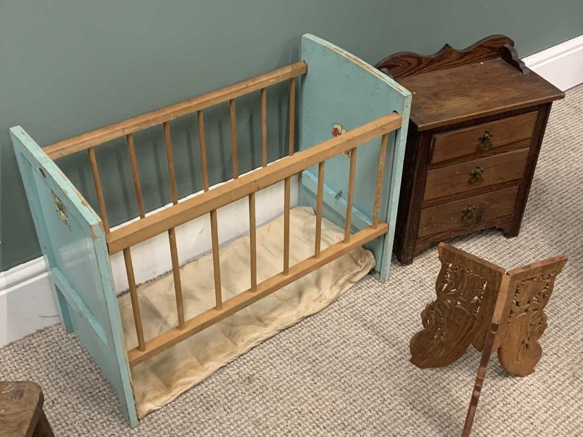 EIGHT ITEMS OF VINTAGE COLLECTABLES / FURNITURE comprising doll's cot, 48cms (h), 63.5cms (l), 31cms (w), child's farmhouse chair, 64cms (h), 32cms (w), 25cms seat depth, three drawer pitch pine apprentice style chest, 44cms (h), 35cms (w), 19cms (d), walnut X frame stool, 36cms (h), 53cms (w), 31cms (d), carved oak milking type stool, 25.5cms (h), 38cms (w), 29cms (d), vintage oak bookstand, 22.5cms (h), 49cms (w), 25cms (d), carved hardwood folding table base, 30cms (h), green painted wall shelf, 16cms (h), 60cms (w), 14cms (d)Provenance: private collection Conwy