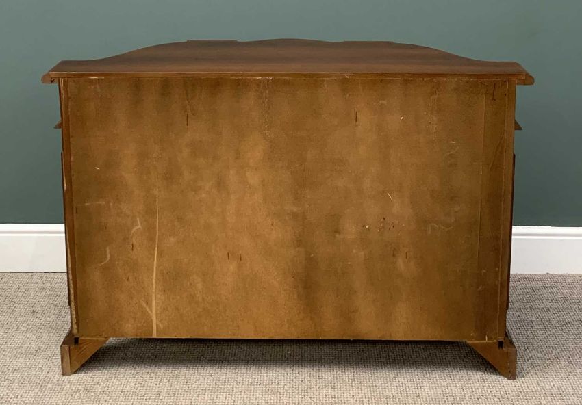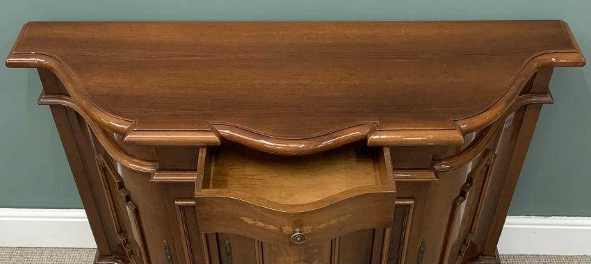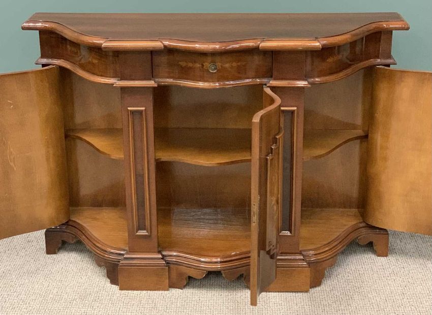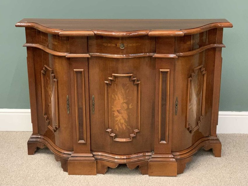 ITALIAN INLAID SERPENTINE SIDEBOARD, moulded edge shaped top, single central drawer, three curved shape cupboard doors, applied moulding, floral inlays, serpentine shape bracket base, 87 (h) x 130 (w) x 44cms (d)Provenance: private collection Conwy