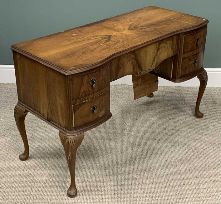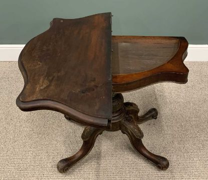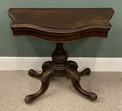 VICTORIAN FOLDOVER CARD TABLE, walnut later dressing table base (for restoration), serpentine top table, turned column, four carved knee splayed supports, knurled feet, brass castors, 73 (h) x 90 (w) x 45cms (d) closed, 74.5 (h) x 125 (w) x 53cms (d) the other itemProvenance: private collection Conwy