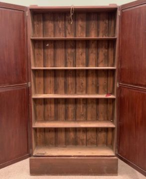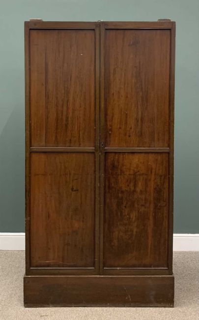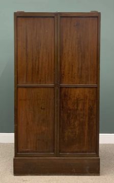 VICTORIAN MAHOGANY HALL CUPBOARD, slim depth, two twin panel doors, interior shelves, substantial plinth base, 204cms (h), 109cms (w), 32cms (d)