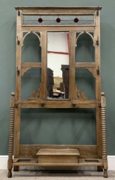 OAK MIRRORED HALL STAND, stained leaded glass upper panel, twin curved brolley/stick apertures, bobbin-turned front supports, lidded central glove box to the lower shelf (no drip trays), 201 (h) x 109 (w) x 33cms (d)Provenance: private collection Conwy
