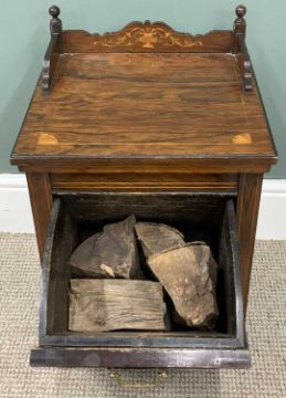EDWARDIAN INLAID ROSEWOOD FURNITURE two items comprising a side cabinet base, bow fronted centre, galleried open shelf, twin upper drawers, twin cupboard doors, inlaid leaf swag detail, turned and block supports, conjoining under tier shelf, 104 (h) x 138 (w) x 46cms (d) and a drop-down front fireside log box, 3/4 rail back top, brass side and front handles, inlaid urn and swag detail, plinth base, 58 (h) x 38 (w) x 38cms (d)Provenance: private collection Conwy