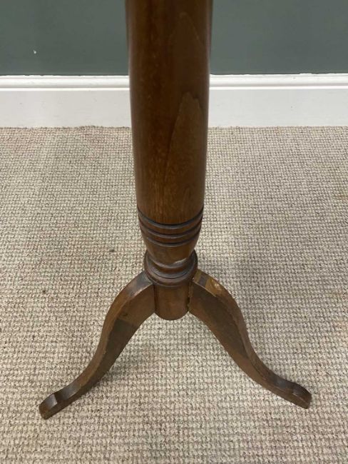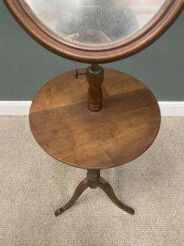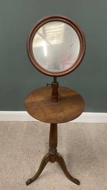 OAK SHAVING STAND circa 1900, 29cms framed mirror, adjustable brass rod, circular top, turned pedestal tripod base, 140cms (h) as displayed, 41cms top diamProvenance: private collection Gwynedd