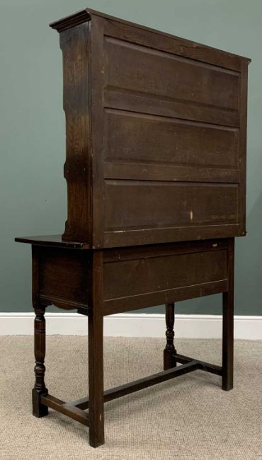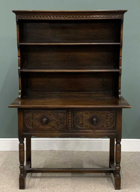 COMPACT REPRODUCTION OAK DRESSER, shape sided two-shelf rack, two deep drawers, carved detail, turned wooden knobs, turned and block supports, cross stretcher, 174cms (h), 104.5cms (w), 51cms (d)Provenance: private collection Conwy
