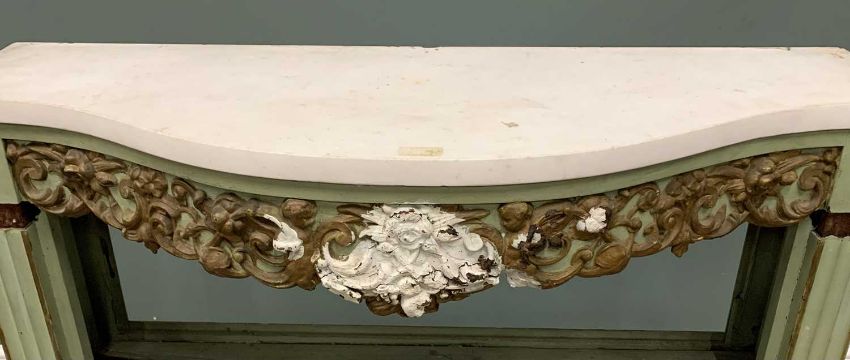VINTAGE MARBLE TOP PIER CONSOLE & A PAINTED OPEN BOOKSHELF, shaped white marble, cherubic and garland swag detail, twin lower shelves, fluted side pillars, plinth base, painted green, 93cms (h), 101cms (w), 36cms max (d), four shelf, shaped upper detail, painted salmon pink bookshelf, 118cms (h), 84cms (w), 32cms (d)Provenance: private collection Conwy