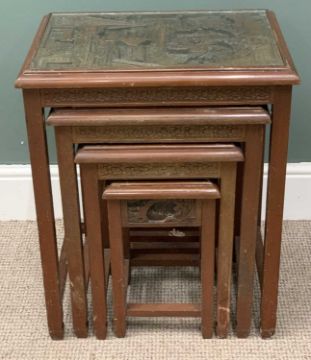 ORIENTAL CARVED TABLE QUARTETTO, deep carved top and frieze detail, square supports, cross stretchers, 64cms (h), 51cms (w), 36cms (d) the largestProvenance: private collection Conwy