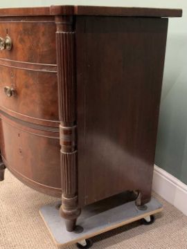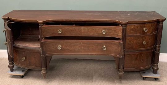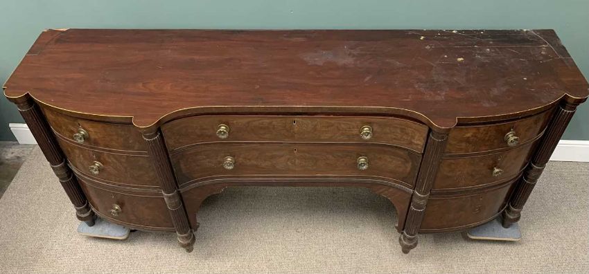 LARGE REGENCY MAHOGANY SIDEBOARD, shaped top, two concave central drawers, outer bow front arrangement, two drawers to the right, upper cupboard and lower drawer to the left, fluted dividing and end pillars, circular brass backplates and floral pattern knobs, bun feet, 92cms (h), 245cms (w), 71cms (d)