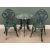 THREE PIECE CAST METAL GARDEN/CONSERVATORY SET comprising circular top table, 66cms (h), 57cms top diam, two chairs, rose cast shape backs, circular seats, splayed supports, 86cms (h), 38cms seat diamProvenance: private collection Conwy