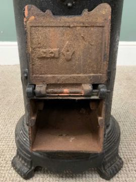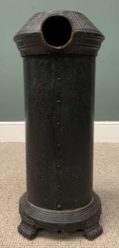CAST IRON CYLINDRICAL STOVE & AN ARTS & CRAFTS STYLE FIRESCREEN, wrought iron and copper firescreen, 'Musgrave's Patent London and Belfast' to the stove lid, 73cms (h), 31cms base foot (w), 31cms (d), 85cms (h), 57cms (w), 21cms foot (d) measurements respectivelyProvenance: private collection Conwy