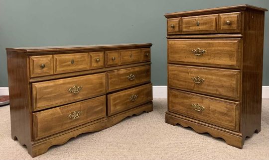 TWO MODERN AMERICAN WALNUT STYLE CHESTS comprising four drawer, turned brass knobs, fancy brass backplates, swing handles, shaped apron plinth base, 106cms (h), 73.5cms (w), 45cms (d), long six drawer chest, matching details, 76.5cms (h), 132.5cms (w), 35cms (d)Provenance: private collection Conwy