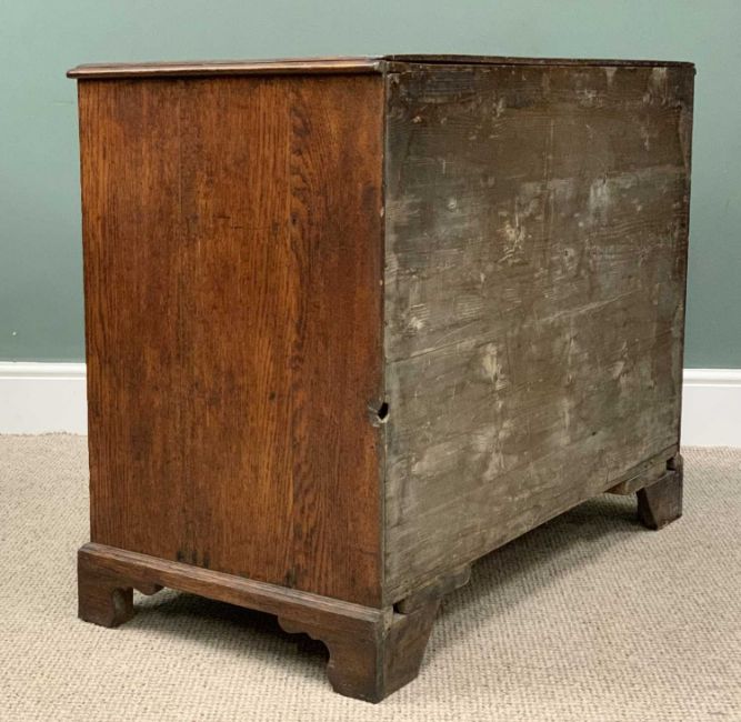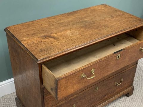 ANTIQUE OAK THREE DRAWER CHEST circa 1840, moulded edge top, pine lined drawers, brass escutcheons, circular pommels, swan neck handles, corner bracket feet, 80cms (h), 101cms (w), 51cms (d)Provenance: private collection Anglesey