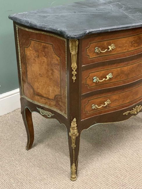 EMPIRE STYLE REPRODUCTION SERPENTINE MARBLE TOP CHEST, shaped grey marble top, three crossbanded walnut drawers, fancy ormolu handles and applied mounts, shaped lower aprons and supports, 86cms (h), 95cms (w), 51.5cms (d)Provenance: private collection Conwy